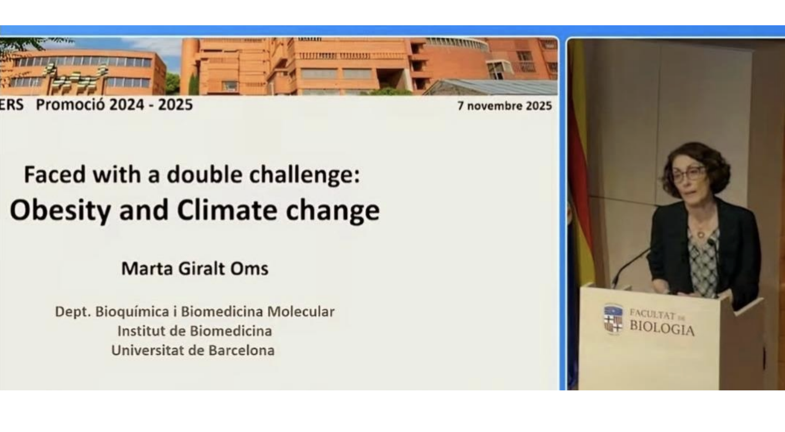 On the occasion of her appointment as patron of the 2024–2025 graduating classes of the Master’s students at the Faculty of Biology of the University of Barcelona, Marta Giralt presented on November 7 the current knowledge on the interrelationship between climate change and obesity, as well as our group’s research on this topic.